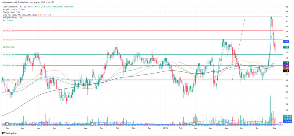 Comfort Delgro closed $1.52 on 4 Aug. Day range $1.50 -1.54.