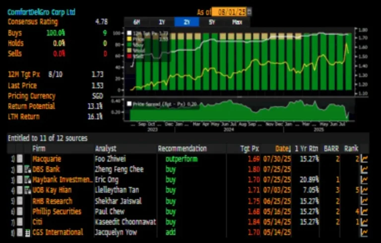 Based on Bloomberg, all eight analysts who cover Comfort Delgro rate it a “Buy” with an average target price $1.73. Together with FY25F dividend yield of around 5.6%, total potential return is around 19%.