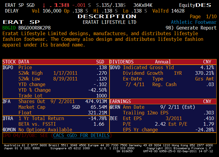 According to Bloomberg, Eratat trades at a 2x FY11F PE. In view of the lackluster equity market and poor sentiment on S chips, it is likely that Eratat may have to take some time to convince investors (by consistently delivering on its results) before it can be re-rated.