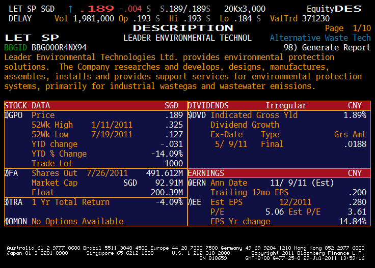 For investors who are interested in China’s environmental industry, yet are not afraid of taking S chip risk, it may be worth their while to take a deeper look into this company. According to Bloomberg, Leader trades at FY11F PE of 3.6x.